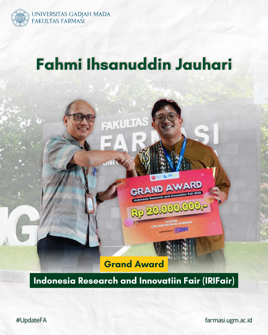Mahasiswa Universitas Gadjah Mada Raih Grand Award pada Indonesia Research and Innovation Fair (IRIFair) 2025 Januari 1, 2026 08:13 Baca Selengkapnya